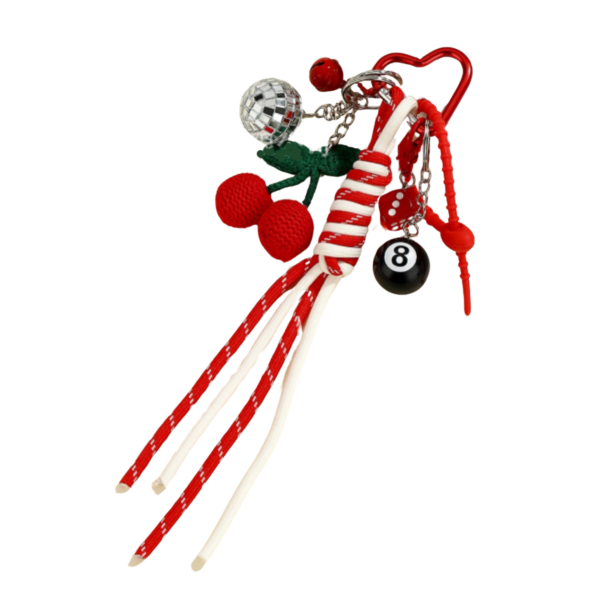 The Cherry & Disco Ball LuxeCharm™ Stack pairs a woven cherry charm with a reflective, faceted disco ball for a fun and flirtatious contrast. Designed to catch both light and attention, each piece is crafted from lightweight resin and metallic finishes for durability and shine. Attached to a polished red-tone clasp, this charm stack adds a playful sparkle and vibrant personality to any MetroLuxe bag or keyring.