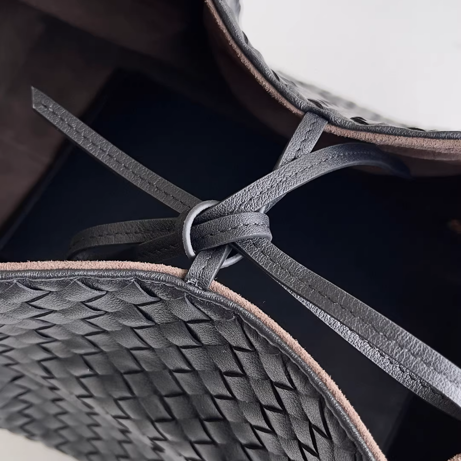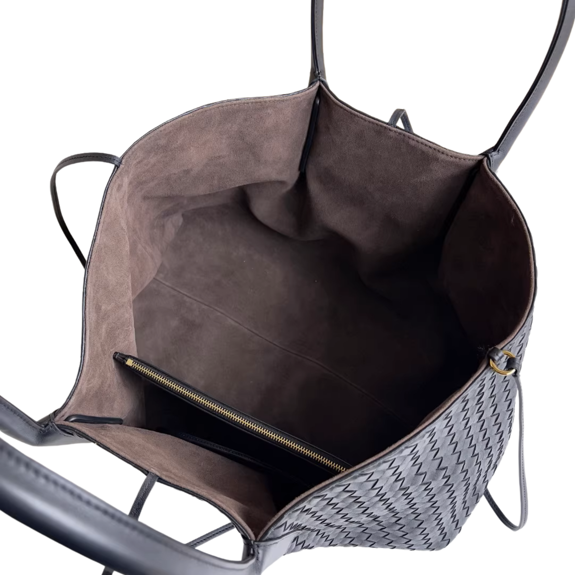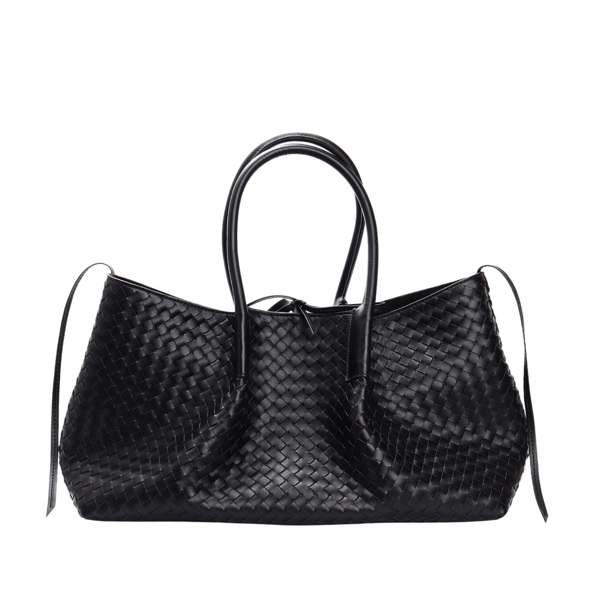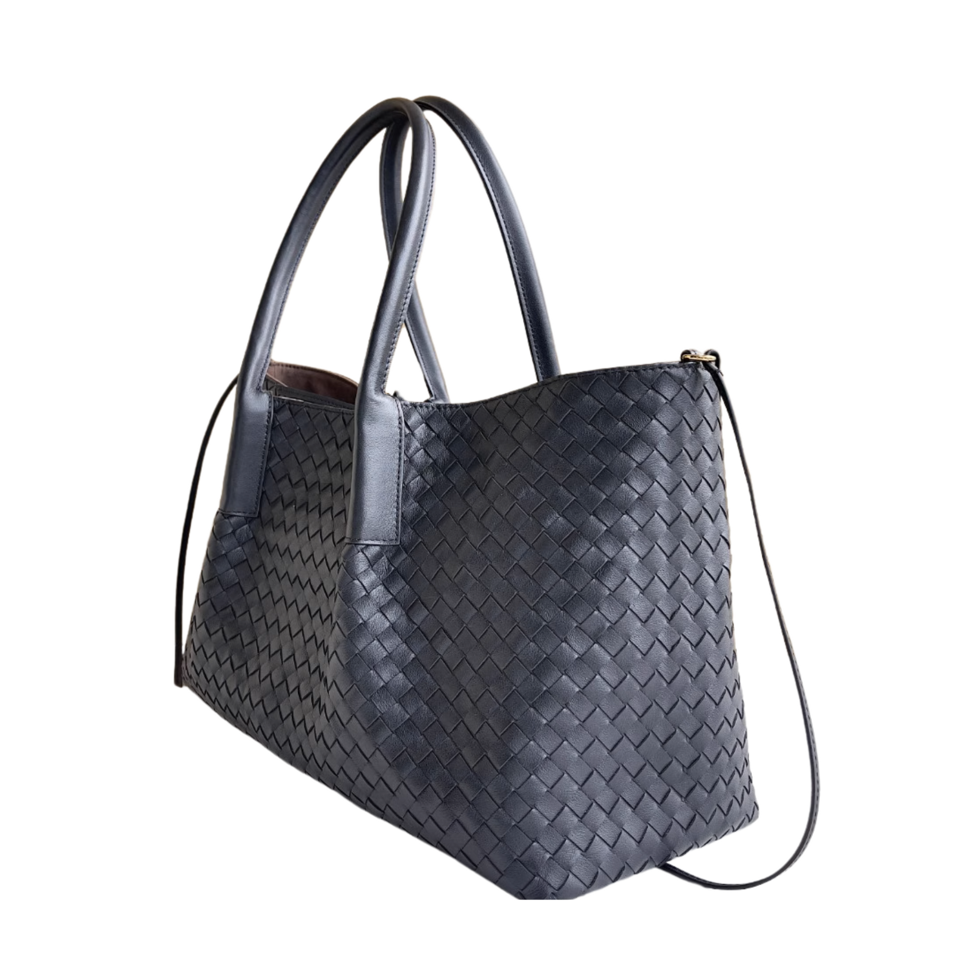 The Astrid features a structured, Intrecciato-inspired exterior, meticulously crafted to give nod to classic artisanal weaving. This architectural tote showcases dual top handles and an optional shoulder strap—ready for both polished arm carry and hands-free days. A refined tie-fasten top keeps the interior effortlessly chic, which opens to a spacious, fully-lined compartment complete with a detachable zip interior pouch for organization. With sleek matte hardware, a reinforced base for shape retention, and an elegant silhouette, this bag blends subtle craftsmanship with modern utility.
